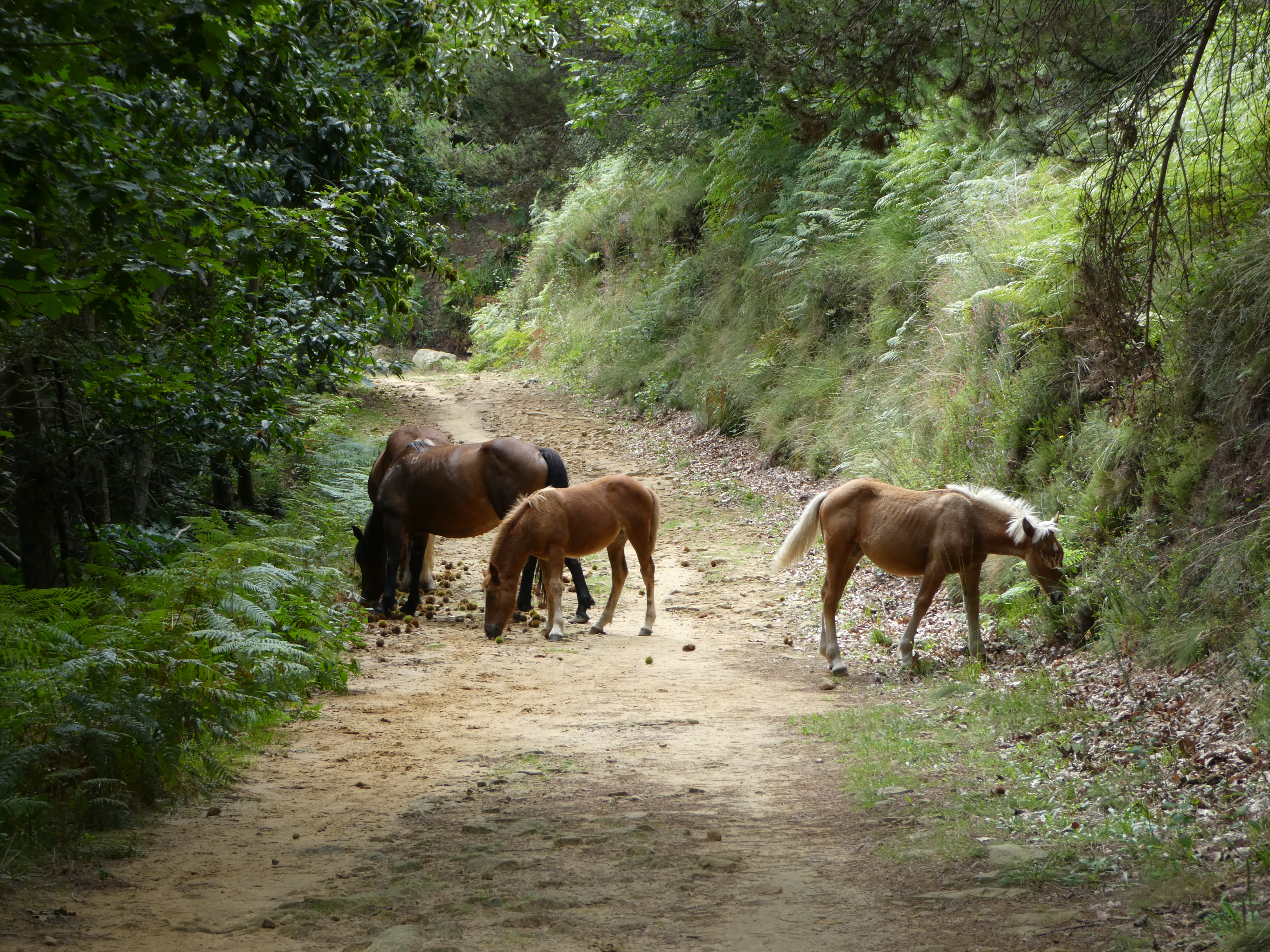 Once on the ridge, it's relatively smooth. I see lots of chestnuts on the ground. And far away, I see some things that are moving... They are horses! Not sure if they are wild horses, but I don't see any human around... Anyway, they don't seem to mind me, on the trail, munching on chestnuts...